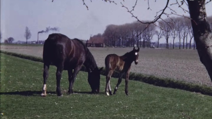 Familiefilm over boerenlandleven, met hooien, jonge dieren, handmatig melken en automatisch melken met Mielemachine en ...
